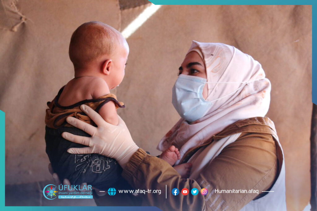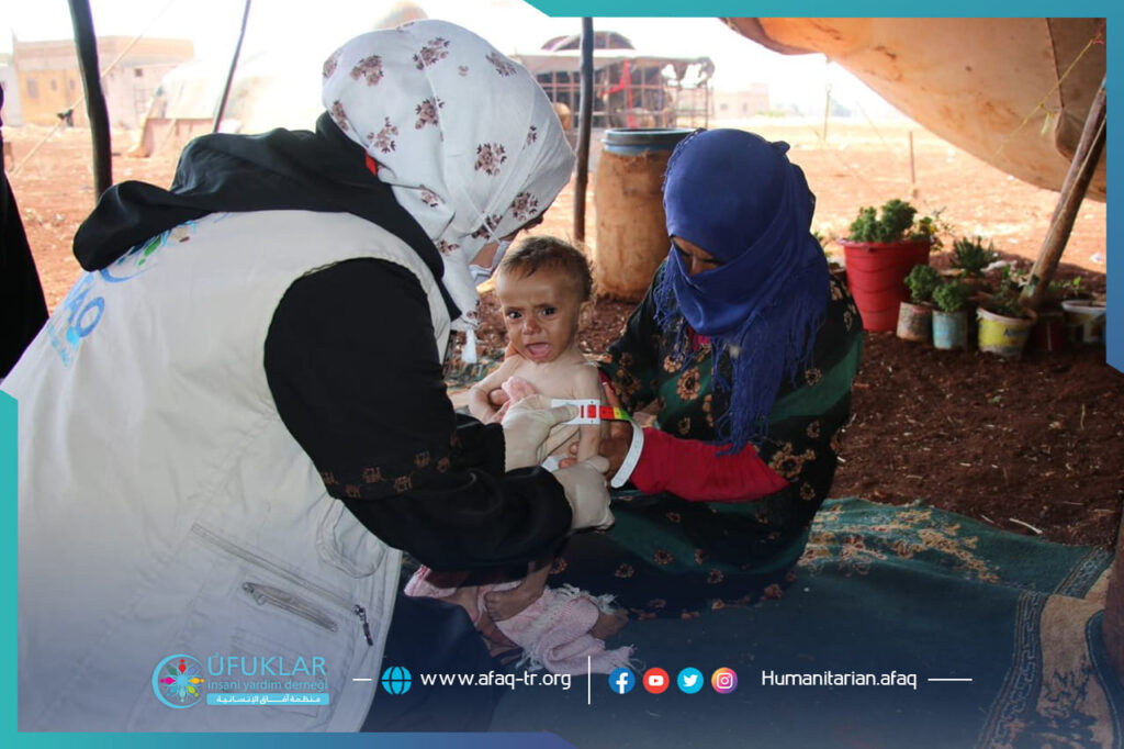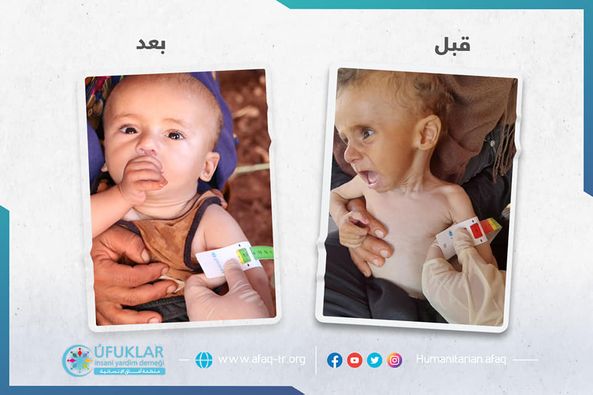 برغم اشتغالها بهموم الحياة والعناية بأطفالها الستة، ورعاية أغنامها التي هي مصدر رزقها ورزق أطفالها الوحيد، إلا أن حالة طفلها الأصغر إبراهيم كانت تؤرق راحتها ونومها، فالطفل بعد عمر الستة أشهر بدأ بالنحول والضعف لدرجة مقلقة.مرت 4 أشهر وأصبح عمر الصغير 10 أشهر، ومازالت حالة الصغير في تدهور ومازالت الأم لا تدري ما تصنع، حتى زارها فريق آفاق التغذوي RRT1 خلال عملية المسح التغذوي في بلدة ترمانين، فشكت لهم الأم حالة طفلها إبراهيم، وبقياس مواك الصغير تبين بأنه 80مم ما يدل على حالة سوء التغذية الحاد الشديد؛ ومن خلال حديث الأم تأكد الفريق بأن السبب الرئيسي لسوء التغذية هو نصحية قدمها لها بعض الأقارب بأن تطعم الصغير حليب الماعز بإضافة الثوم، فبدأ الصغير بالنحول حتى وصل إلى هذه الحال. طمأن الفريق الأم وأدخل الصغير في برنامج علاجي لسوء التغذية، وكبداية وحسب حالته منحه الفريق ظرفين من الزبدة العلاجية يومياً، إضافة لبعض النصائح والإرشادات التي لابد وأن تلتزم بها الأم.ومرت الأيام وأحست الأم بتحسن طفلها وتحسن حالته العامة، وباستمرار متابعة الفريق للصغير والأم أصبح إبراهيم بحالة جيدة جداً بعد شهرين من بدء العلاج، وتم تخريجه من حالة سوء التغذية الحاد الشديد إلى حالة الشفاء بمواك 130مم. وبرغم ذلك سيظل الفريق في حالة متابعة للصغير لفترة زمنية محددة، حتى لايعود لسوء التغذية من جديد، ويكسب جسمه قوة كافية تحول دون انتكاسته وعودته للمرض.