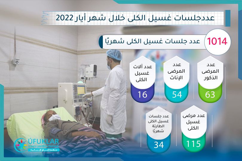 تساهم #آفاق_الإنسانية بتحسين جودة حياة الكثير من مرضى الكلى عبر تقديم خدمة الغسيل بشكل إسعافي ودوري ..نحو مزيد من الأمل، مستمرون في آفاق في القيام بواجباتنا الإنسانية والإغاثية لأهلنا في الشمال السوري. تعرف من خلال الصورة على أعداد الجلسات وبعض الإحصائيات المتعلقة بمركز الغسيل خلال شهر آيار من هذا العام .
