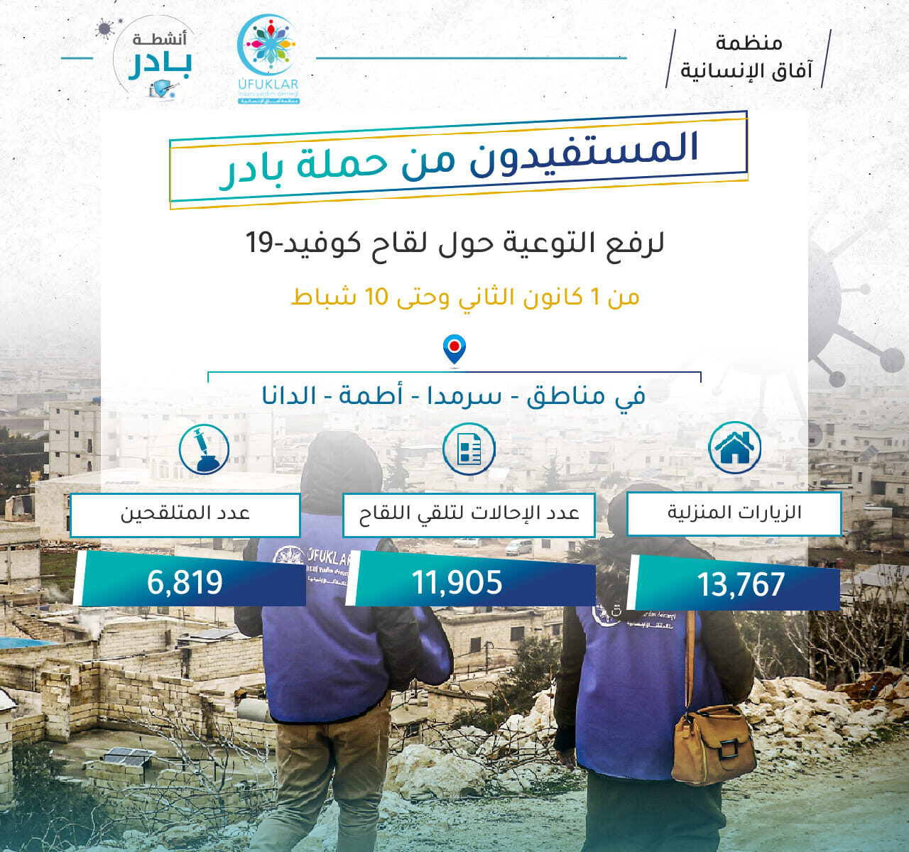 أعداد وإحصائيات مبشرة للمستفيدين من أنشطة بادر وذلك حتى تاريخ 10 شباط من العام الجاري.. أعداد تمدّنا بالعزيمة وتدفعنا للاستمرار في كافة الأنشطة التوعوية لأهالينا بما يخص فايروس كوفيد ومخاطره واللقاح ..
