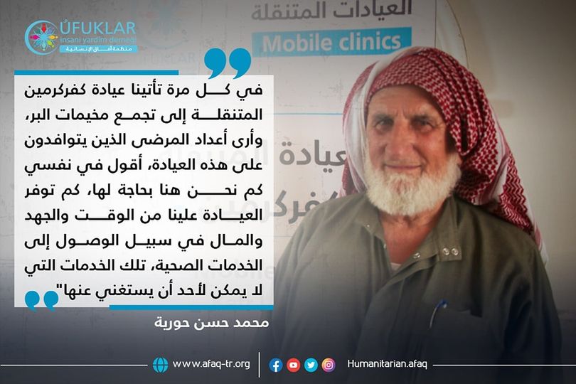 العم محمد حوريةـ 63 عاماًـ أحد مرضى عيادة كفركرمين المتنقلة، يشكو من التهابات تنفسية وآلاماً في المعدة، قدمت له العيادة الخدمات الصحية المناسبة ليشعر بعدها بتحسن كبير، ليأتي فيما بعد شاكراً العيادة وكوادرها..في الصورة المرفقة اقتباس من كلام العم محمد..