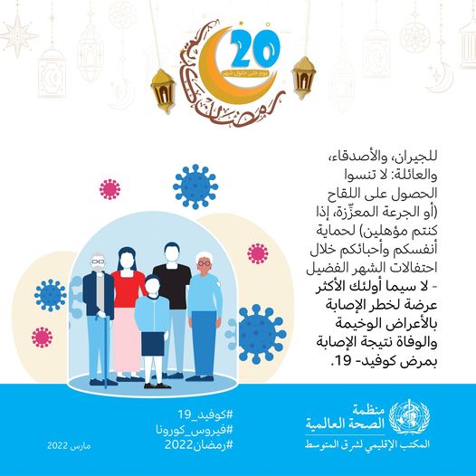 رمضان شهر التجمعات على موائد الإفطار..شهر الصلوات في المساجد..قبل قدوم الشهر الكريم، #منظمة_الصحة_العالمية ترشد الصائمين للمسارعة بأخذ جرعات لقاح Covid_19 لحماية نفسك وأهلك ومجتمعك.. بلغكم الله شهر رمضان..