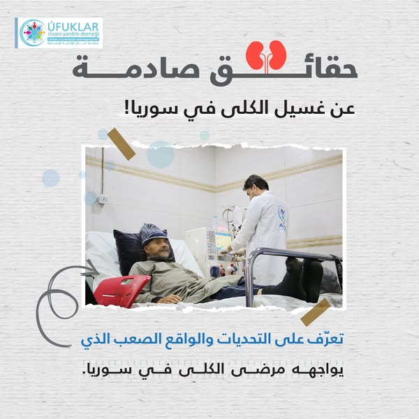 يواجه آلاف مرضى الفشل الكلوي في سوريا، معاناة يومية للوصول إلى جلسات الغسيل الكلوي. كل تأخير في العلاج يعني المزيد من الألم والمخاطر على المرضى. إنقاذ حياتهم مسؤوليتنا جميعًا!