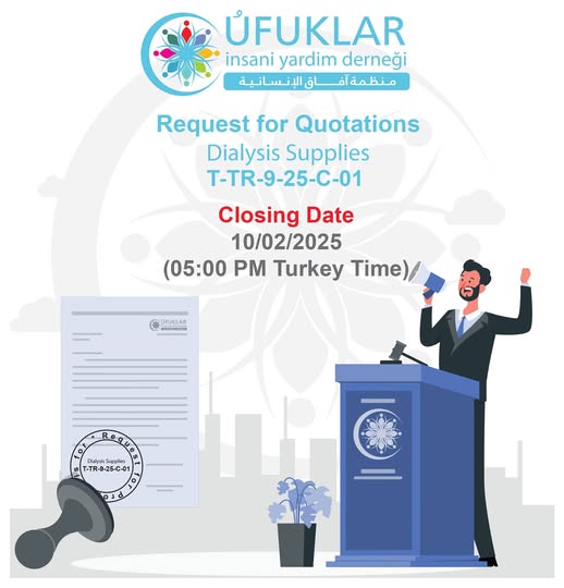 AFAQ Humanitarian Organization invites qualified and eligible suppliers to submit bids for the procurement of 30,000 dialysis supplies to be distributed to dialysis centers in Northwest Syria. This project aims to ensure the continuous provision of life-saving dialysis treatments for patients suffering from end-stage chronic renal failure.